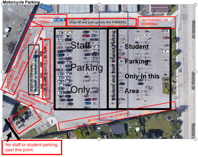 5) Parking for Grade 12 students is on a first-come first-served basis. A Grade 12 parking pass gives the student the right to park in the student parking area of the lot, it does not give the student a right to a parking spot. Students who cannot find a place to park in the parking lot will have find a legal parking spot on the street in the surrounding neighbourhoods.